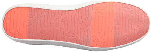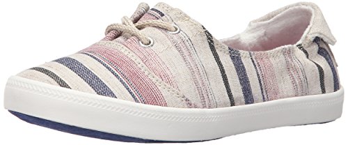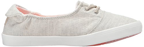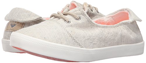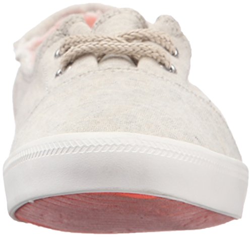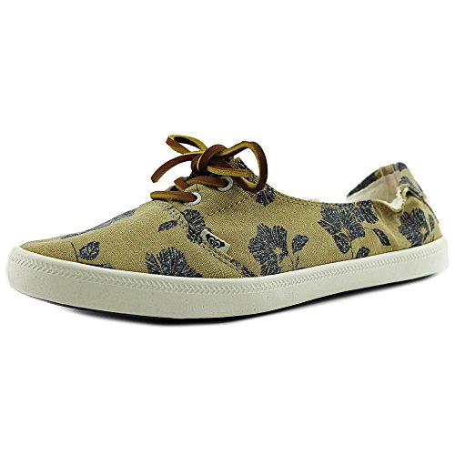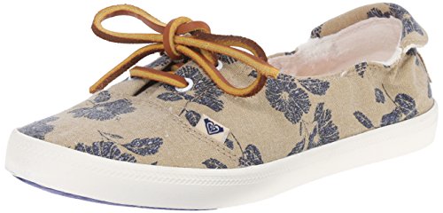 Textile upper shoe with jute lace up detail, back heel tab, gusseted tongue, memory foam padded insole with print, woven roxy heel patch label, and flexible vulcanized outsole.