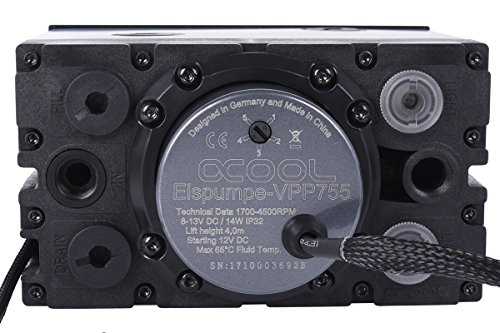 The step towards perfection This new Alphacool dual 5.25" bay reservoir comes with a preinstalled Alphacool VPP755 Eispump. The brushed plate provides an optical finishing touch which is underlined by the high quality processing. The front consists of a scretch-secure soft-touch surface painted in black-matt. The Eisfach is mounted in two of the front 5,25" bays which provides a good overview of the container and the fill level is easily being checked through the lighted window at the back. Additionally, the Alphacool logo in the front can be lighted by connecting the 3-pin connector with a power source. A lot of details complement the first impression Two 1/4" holes at the top side are available for the first filling. To refill you can simply remove and extract the fillport in the front and two 1/4" holes at the bottom side facilitate the draining of the liquid. There are two lighting modules at the right hand side at the back of the container behind the window for 5mm LEDs. This provides a unique opportunity for personalised lighting and optic. Further two holes at the left hand side provide additional opportunities to fill or drain the liquid. The last two 1/4" threads are used to fill or drain the container. A Bubble Down module has been placed behind the inlet to prevent turbulences that could lead air into the watercircle. Eisfach Technical Specifications Material: plastic, metal Colour: black Dimensions (LxWxH): 148 x 132 x 84.5mm Connection threads: 10x 1/4" Lighting: 2x 5mm LEDEispump Technical Specifications Dimensions (DxH): 60 x 53.5mm Cable length: 50cm Standard voltage: 12V DC Power consumption: 14W Permitted voltage: 8-13V DC Pressure at 12V: 4m water head Maximum flow rate: 350l/h Pump medium: water, water/glycol mixture Maximum system temperature: 65C Powe... 0 |