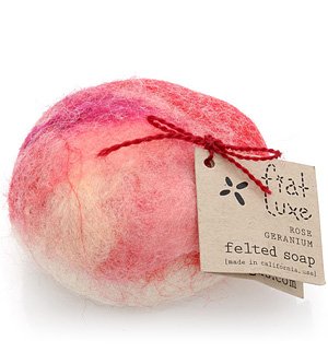 The combination of rose geranium oil and sweet orange oil uplifts your spirits. And, with the addition of ground rose petals it makes a great facial soap. These luscious bars of soap are wrapped in wool to create a soap and washcloth all in one. Wool has natural anti-fungal properties and will retain its freshness. The wool acts as a wicking agent, soaking in the lather of the soap, making the encased soap last longer. The felt shrinks along with the soap as you use it, and the casing may be reused by slitting along the edge and inserting a new bar of soap. These make great travel gifts and may be used to add wonderful fragrances to your car or linen closet.Feature