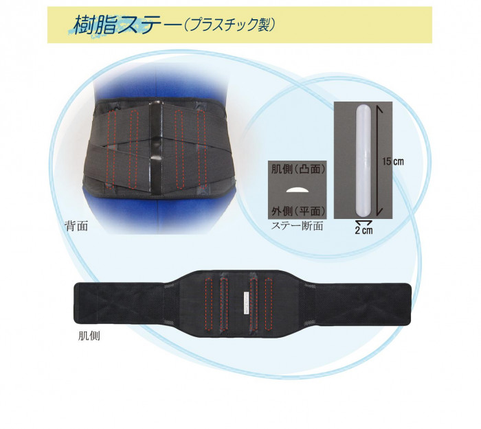 | 上下対称構造のため、ご自身の使いやすい合わせ向き(右前or左前)で装着できます。4本の樹脂ステーで、効果的にサポートします。メッシュ素材のためムレなどを防ぎ、快適な装着感です。 |