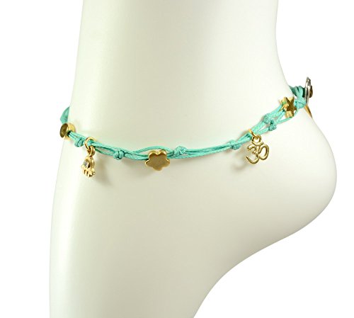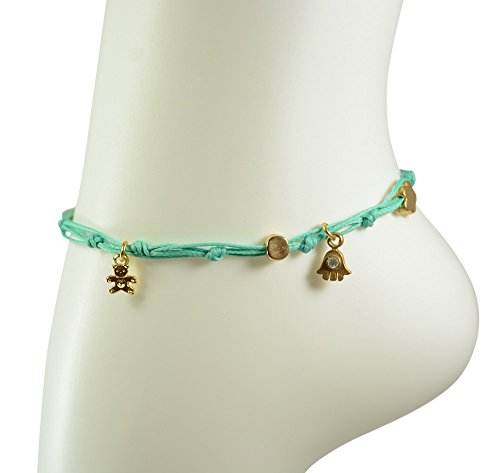 -. Binding : Jewelry -. Brand : MIZZE Made for Luck Jewelry -. Department : womens -. Feature : Beautiful Handmade wax wire anklet in turquoise / Charms include Om, Teddy Bear, Star and Hamsa / All charms are 24k gold plated / The anklet is a standard size 11" / A cool meditation/yoga and relaxation anklet -. Label : MIZZE Made for Luck Jewelry -. Manufacturer : MIZZE Made for Luck Jewelry -. Model : MZ3000TQG -. ProductGroup : Jewelry -. ProductTypeName : FASHIONNECKLACEBRACELETANKLET -. Publisher : MIZZE Made for Luck Jewelry -. Studio : MIZZE Made for Luck Jewelry -. Title : Turquoise Anklet with Gold Plated Luck Charms