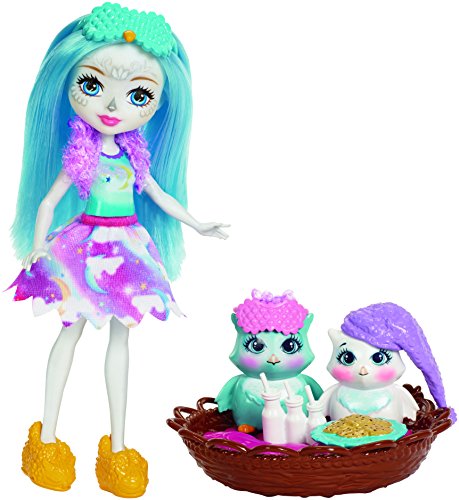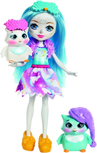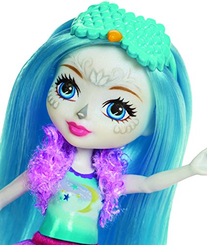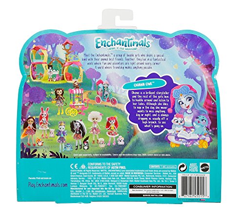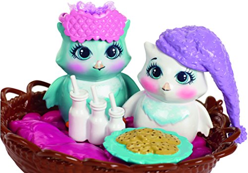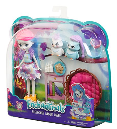 The Sleepover Night Owls storytelling pack, inspired by the world of Enchantimals, is positively enchanting -- a six-inch Ohana Owl doll, two owl friends and accessories create a friendly forest scene. The sleepover set pieces are colorful and have fun details to inspire storytelling. The owl's bed is shaped like a nest with a pink cushion-design inside and branch details outside; an open storybook inspires creativity; and three milk bottles and a plate of cookies are perfect for the trio of friends! Enchantimals Ohana Owl doll is ready for sleepover fun wearing a colorful cloud print on her removable skirt, yellow slippers and furry stole. An eye mask is perfect for sweet dreams, and dreamy touches include long blue hair and owl-inspired facial features. Her two owl friends -- one medium and one small -- are adorable with furry hair. One has a nightcap and the other a sleep mask. Who'll stay up the latest? Kids will love recreating the wonder of nature and celebrating a world where Caring Is Our Everything. Collect them all to build out a world of Enchantimals and tell enchanting stories of your own (each sold separately, subject to availability). Includes Enchantimals Ohana Owl doll wearing fashions and accessories, one medium-sized owl figure, one small owl figure, one nest bed, one storybook and a plate of cookies. Colors and decorations may vary.Feature