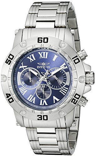 Studio : Invicta Publisher : Invicta Binding : Watch Product Description Brighten up your day with this shiny men's timepiece brought to you by Invicta's Specialty collection. The sleek silver-tone stainless steel bracelet and case are sure to grab the awe and attention of those around you. The smooth blue dial acts as a tachymeter and a three subdial chronograph on a 48mm case, perfect for every occasion. 0