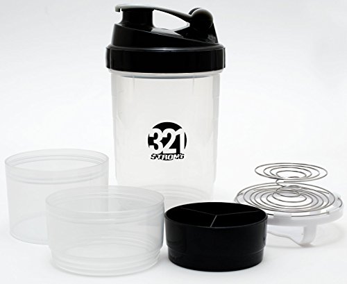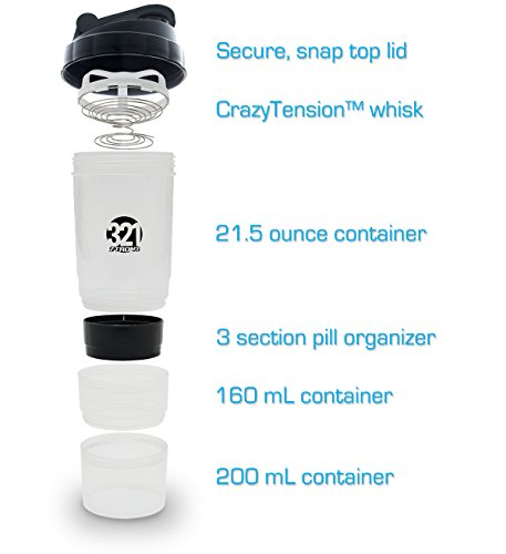 Our stacking 3-in-1 mixing bottle features two extra storage compartments , so you can fill them with pre and post workout sports blend powders . There's also a handy vitamin and supplement tray that fits neatly inside the top compartment . Attractive frosted clear body with glossy black plastic cap . Measurements are easy with graduation lines on compartment side . The expansion sections fit inside the main bottle for smart space saving storage . No ball to lose , our CrazyTension™ spring stays attached to the lid . One of the best gym accessories for overall fitness , health and bodybuilding . You can keep unmixed water handy in the main compartment , and just add your nutrition drink powder and mix . Making weight loss smoothies and sport drinks no longer requires noisy blenders . Put your supplements and powders in the handy containers and store for later . Includes lifetime manufacturer's warranty and 100% satisfaction guarantee . We will refund your money if you don't think this is the most effective protein shaker bottle you've ever used .Feature