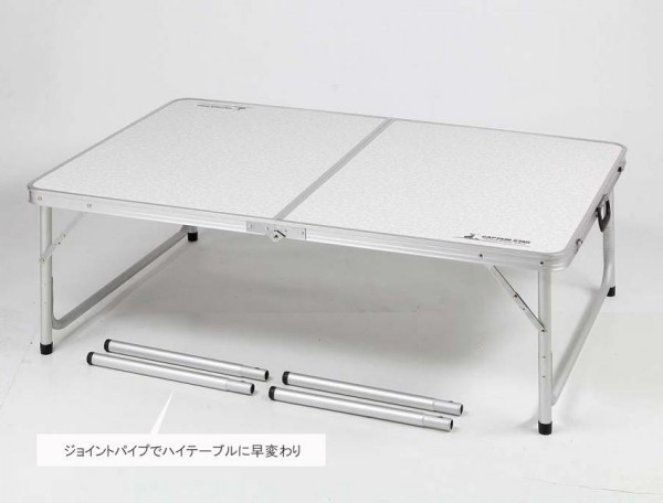 | ジョイントパイプの取り付け・取り外しは簡単なワンタッチジョイント式。天板裏側にジョイントパイプ収納用アタッチメント付きです。ロータイプ使用時には取り外したジョイントパイプの収納に便利。ジョイントパイプを外し、脚部を折りたたむだけのシンプルな構造なので組立・収納が簡単です。合板とアルミ脚を使用しているので軽くて丈夫、天板裏とアルミ脚は補強付なので強度がアップ! |