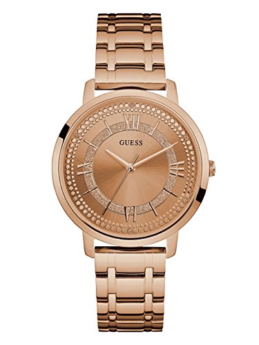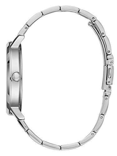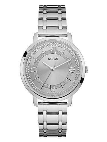 Analog timepiece lends a silver-tone finish to your look with a polished steel bracelet and glitter/embossed details at dial