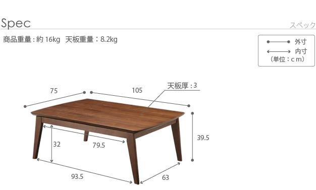 天板サイズ:幅105x奥行75cm・厚み30mm・8.2kg