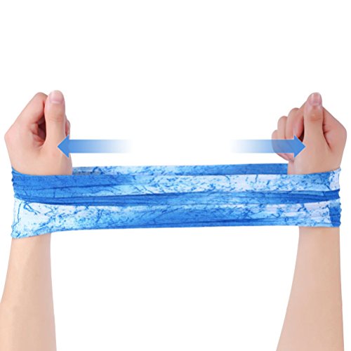 Features - Color: Blue andamp; White. - Material: Polyester. - Size: Approx. 51 * 27cm/ 21.6 * 10.6 inch (L*W*H). -Breathable, sweat absorbentand fast-drying with great elasticity for convenient use. - Soft and smooth texture. Won't itch your skin in discomfort. Comfortable to wear. -Seamless craft with great windproof function.Can be used as headband, scarf, face cover, wrist band and so on.