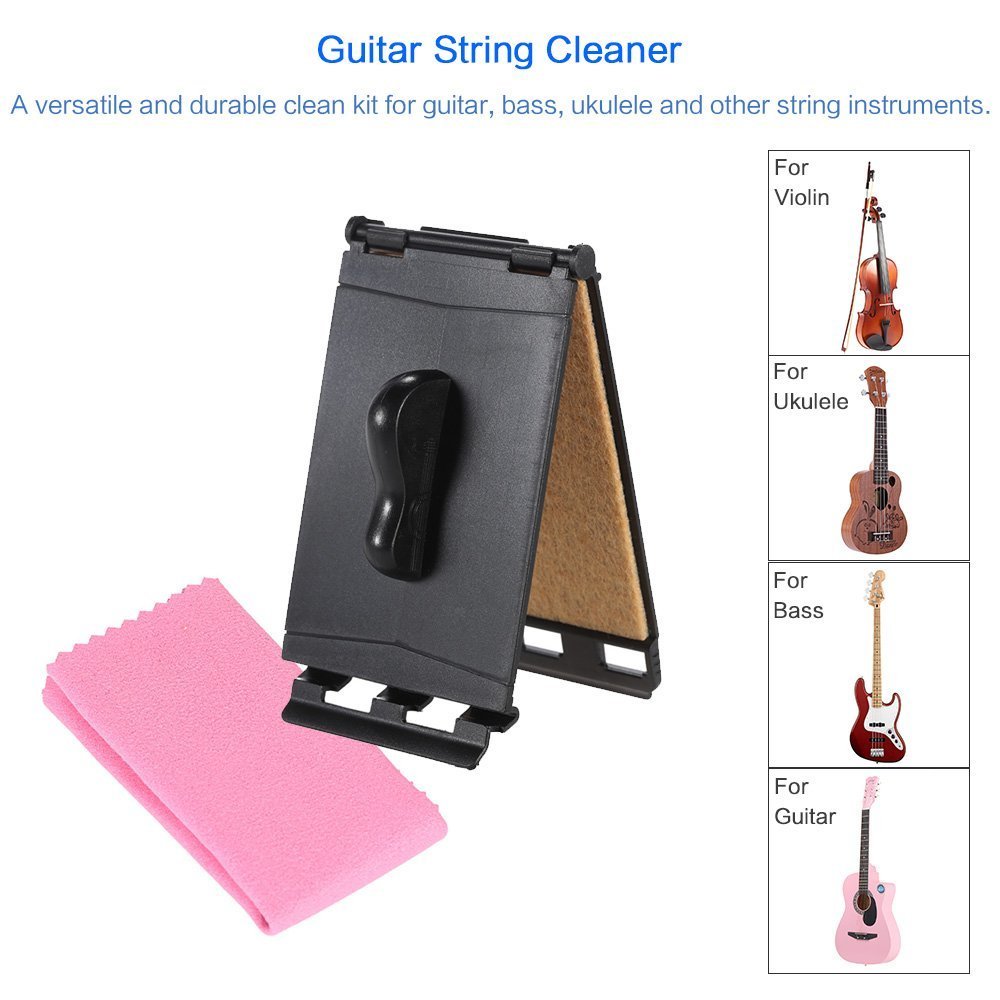 The string scrubber efficiently cleans strings, frets, finger boards.