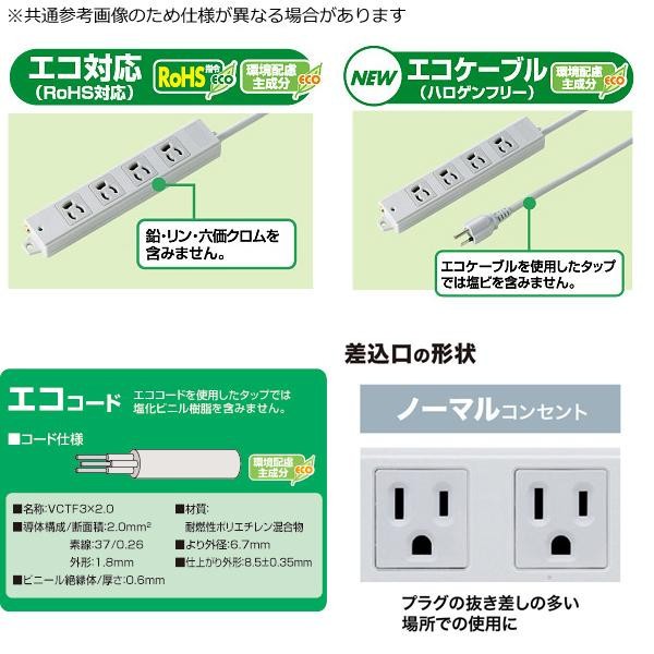 | 6個口(3P)、3Pプラグ(絶縁キャップ付き)のタップです。塩ビを使用しないハロゲンフリーのエココード(エコケーブル)を採用しています。耐燃性ポリエチレン混合物を使用して、燃やしてもダイオキシンが発生いたしません。 |