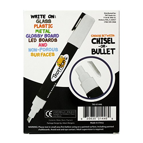 These easy-to-use, water-based markers are an innovative alternative to traditional chalk. They have hi-opaque, pigmented inks that are, lightfast, odorless and xylene free. Use them on any non-porous surface like chalkboards, windows, mirrors, dry erase boards, light boards, windshields and ceramics or as permanent color on wood and other porous surfaces. They draw and write very smoothly, dry quickly and they wipe off in cinch. Simple to use for writing messages to your friends and family, advertise specials, market new products or events at restaurants, retail and coffee shops. Each markers comes with a reversible tip that allows you to select either chisel or bullet tip points. Each tip is 6mm wide to allow you to get the best details, yet make it broad enough to see from afar! This set also comes with 8 bonus chalk labels as well as 2 replacement tip refills!Feature