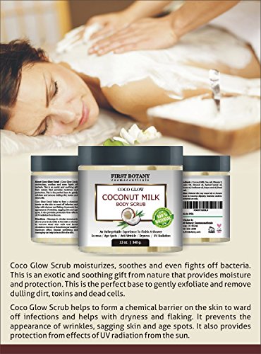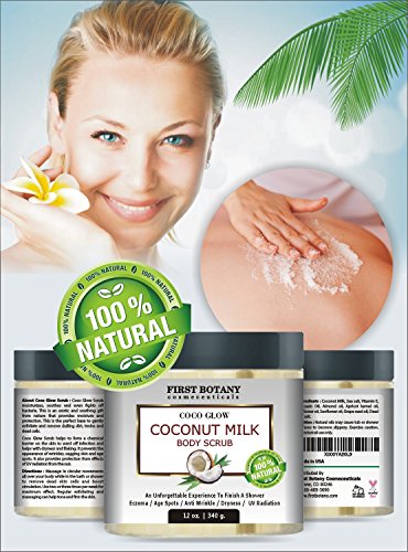 - Feature : BODY POLISH SCRUB: Coconut Milk Body Scrub is an exotic and soothing gift from nature that provides moisture and protection. Made with Coconut, a touch of 6 essential oils abundant with vitamins A, B and E and full of fatty acids to rejuvenate and exfoliate your skin. This Invigorating body scrub is the perfect base to gently exfoliate and remove dulling dirt, toxins and dead cells. Natural antioxidants work together to make skin look young and healthy. Gentle enough for everyday use. / BENEFITS: The regular use of the scrub helps to form a chemical barrier on the skin to ward off infection & reduce the symptoms of psoriasis, eczema, and dermatitis. It supports the natural chemical balance of the skin & softens skin and helps relieve dryness and flaking. This anti aging scrub prevents the appearance of wrinkles, sagging skin and age spots. It promotes healthy looking complexion & provides protection from effects of UV radiation from the sun. / BODY SCRUBBER & NATURAL EXFOLIATOR SKINCARE: Our CocoGLow is not overly greasy, spreads easily, and has a pleasant light scent. Coconut milk is loaded with fats, nutrients and minerals that are good for the skin and hair. In particular, it's rich in protein which is fabulous for damaged skin. This mild formula is 100 percent sulfate free, and contains natural ingredients that purify and exfoliate for a radiant complexion. / EXCELLENCE BY VIRTUE OF HIGH STANDARDS: First Botany only complies with Mother Nature and will always strive to using 100% all natural ingredients. We thrive on customer satisfaction and take glee in the trust they put in us. We provide superior product knowledge to our valuable customers with meticulously clear labels. In all of that capacity we try to go green and nature friendly, we use recycled materials in our packaging, promoting paraben free and cruelty free products. / BUY NOW WITH 100% SATISFACTION GUARANTEE : Purchase with complete peace of mind, we endorse our products to be of the highest quality and most effective in the market. Our Coco Glow natural Coconut body scrub will provide your skin a more glowing and radiant appearance upon 1st use. If you are not completely satisfied with the product, we will refund your entire purchase.