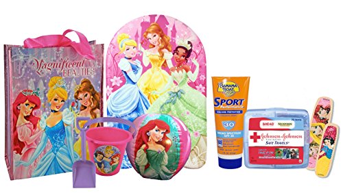 -. Feature : (1) Disney Princess Mediuem Sized Tote Bag Featuring Princess Ariel, Cinderella & Belle- Resuable, Light Weight & Convienant! / (1) Princess Foam Kickboard (1) Princess Beach Ball (1) Princess Sand Bucket (1) Shovel / (1) Plus Bonus JOHNSON & JOHNSON First Aid To Go Kit - Includes: 4 Princess Band-Aid Brand Adhesive Bandages( Assorted Characters), 2 cleansing wipes; 4 First Aid Gauze Pads, 6 Flexible Fabric Adhesive Bandages & 1 Durable Plastic Case. / Banana Boat Sport Sunscreen SPF 30, 1 Fl Oz Travel Size