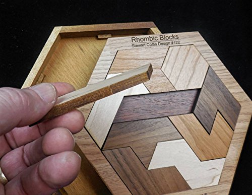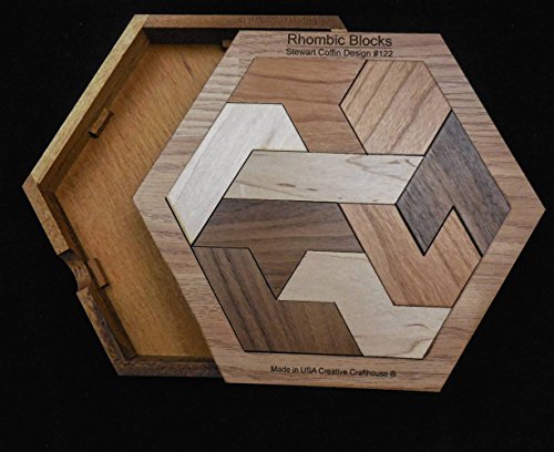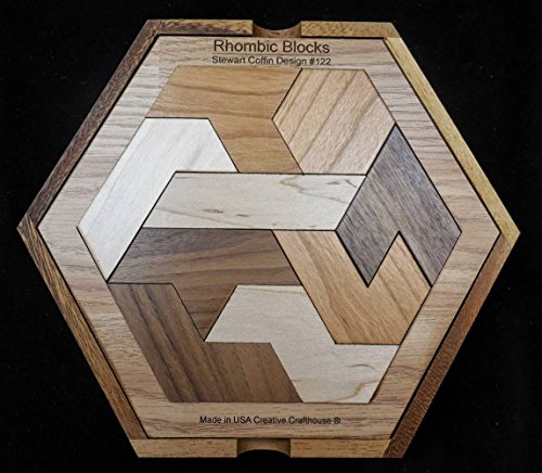 -. Binding : Toy -. Brand : Creative Crafthouse -. Feature : A nine piece puzzle which represents every way that three rhombic blocks can be joined. There are 14 possible solutions to inserting the pieces in the hexagon shaped frame. One of these 14 however is rather unique and is your challenge goal. This solution involves no piece of the same wood type (color) touching. Can you find it, as well as the 13 other solutions ? (one solution shown as packed). / There will be 3 contrasting woods used in each puzzle. Woods are strong at quarter inch thick with an excellent laquer finish. Puzzle includes base and cover. Measures in the cover about 7 inches across the flats and 8.2 inches across the points of the hexagon. Made in our Hudson, Florida shop. Thanks to Stewart Coffin for allowing us to make his designs. -. IsAdultProduct : 0 -. Label : Creative Crafthouse -. Manufacturer : Creative Crafthouse -. MPN : RhombicBlocks -. PackageQuantity : 1 -. PartNumber : RhombicBlocks -. ProductGroup : Toy -. ProductTypeName : TOYS_AND_GAMES -. Publisher : Creative Crafthouse -. Studio : Creative Crafthouse -. Title : Rhombic Blocks - Stewart Coffin design #122 Brain Teaser Puzzle