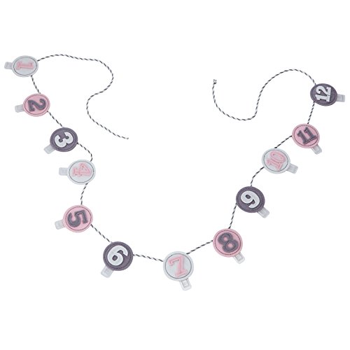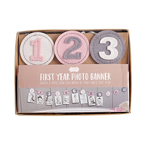 [Product Information]- Festive layered milestone banner features felt numbers with attached clips for photo journaling and twisted gray and white cord for hanging.