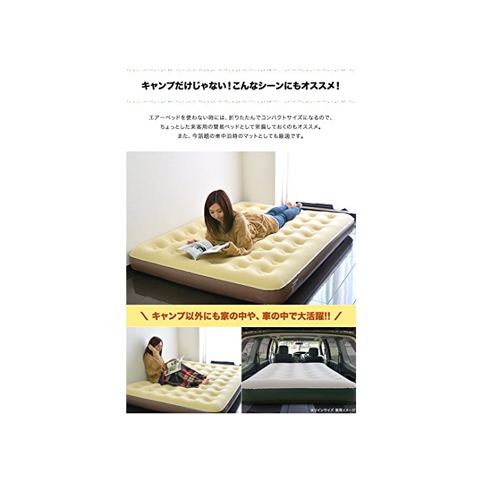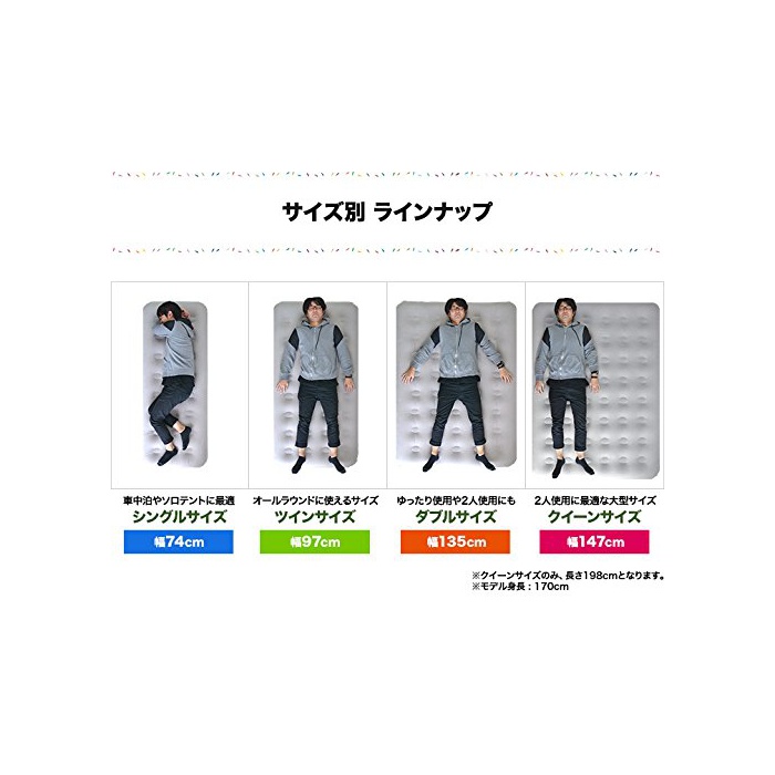에어 베드: 사이즈 (약)폭147cm×(길이)깊이198cm×두께23cm 퀸 에어 베드: 사이즈 재질 PVC(표면 : frock 마무리) 중량 (약)3.2kg 내하중 (약)150kg