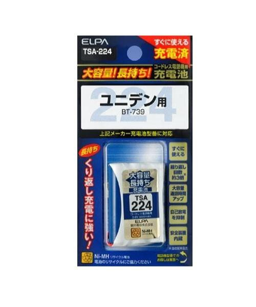 自己放電を抑制します。さらに安全装置が内蔵されています。 製造国:中国 仕様:適合機種・ユニデン:BT-739 同等品電話機用3.6V 800mAhニッケル水素充電池(充電済) ※サプライヤー直送品 ご注文後2~3営業日後の出荷となります【商品名】ELPA(エルパ) 大容量長持ち充電池 TSA-224 1833700