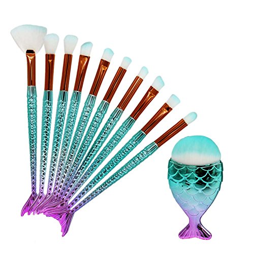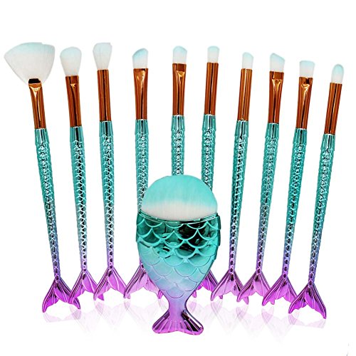 Boniss 11Pcs Mermaid Makeup Brushes Set with Bag Foundation Powder Eyeshadow Kits Synthetic Foundation Blending Blush Eyeliner Face Powder Brush...