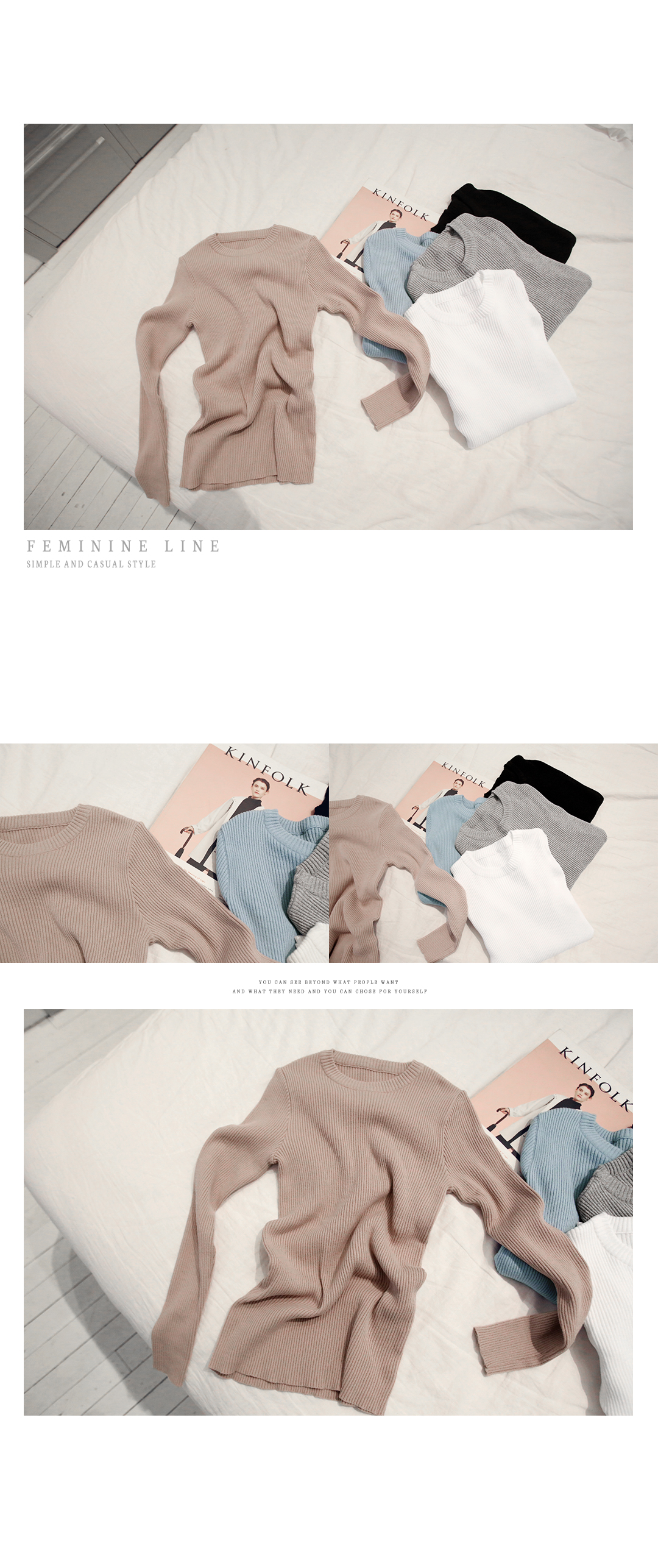 깔끔하고 심플한 스타일의 골지티 소개해드릴께요.군더더기 없는 베이직라인의 디자인에 골지짜임으로 밋밋하지 않으면서도여유있게 파인 라운드 넥라인으로 편안하고 모던한 매력의 제품인데요.바디실루엣에 맞춰 자연스럽게 핏되는 사이즈로 슬림해보이며도톰한 소재로 보온성이 좋고 신축성이 뛰어나 편안한 착용감을 느끼실 수 있어요.어떤룩과도 두루두루 잘 어울려 데일리 아이템으로 스타일링 활용도가 높은 아이템이랍니다.