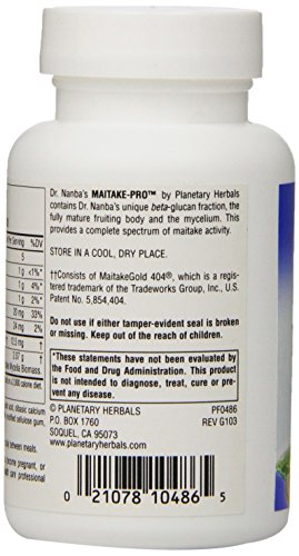 -. Binding : Health and Beauty -. Brand : Planetary Herbals -. EAN : 0021078104865 -. Feature : Maitake is a japanese mushroom closely related to polyporus / The word maitake is literally translated from japanese as dancing mushroom / Maitake is recognized by its small overlapping tongue- of fan-shaped caps -. IsAdultProduct : 0 -. Label : Planetary Herbals -. LegalDisclaimer : * These statements have not been evaluated by the Food and Drug Administration. This product is not intended to diagnose, treat, cure or prevent any disease. ** Always refer to the manufacturer's label on the product for description, recommended dose and precautions. -. Manufacturer : Planetary Herbals -. MPN : GP1706 -. NumberOfItems : 1 -. PackageQuantity : 1 -. PartNumber : GP1706 -. ProductGroup : Health and Beauty -. ProductTypeName : HEALTH_PERSONAL_CARE -. PublicationDate : 2013-08-20 -. Publisher : Planetary Herbals -. ReleaseDate : 2015-06-22 -. Size : 60 -. Studio : Planetary Herbals -. Title : Planetary Herbals Dr. Nanba's Maitake-PRO Tablets, 60 Count -. UPC : 021078104865