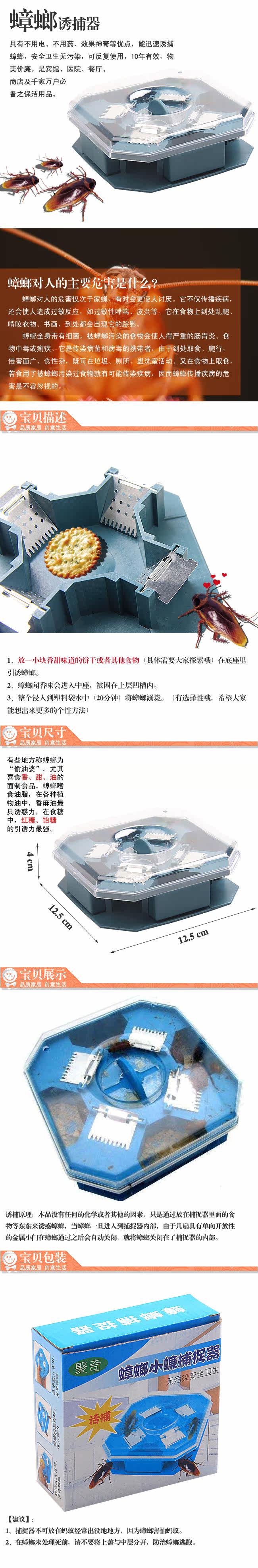 This product is the latest research of cockroach catcher.The product overcomes the inadvertent insult to fruits and vegetables due to spraying chemical agents and the lack of home environment.This practical product,