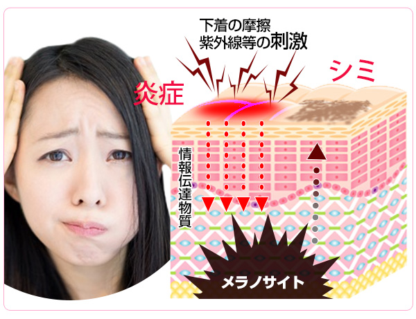 | ①肌が黒ずむ原因のひとつに外的刺激があります。 同じ部分に刺激が加わえ続けると肌を強くして刺激から守ろうとする保護成分が働きメラニン色素が増えて黒ずむのです。 |