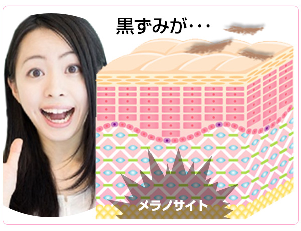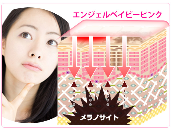 | ②エンジェルベビーピンクに配合されている美白成分はメラニン色素をつくる「メラノサイト」まで届き、メラニンが皮膚の表面に出てくるのを抑え、将来できる黒ずみを抑えます。 |