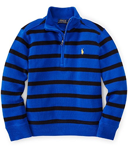 Ralph Lauren's classic French-rib cotton sweater gets a fun update with a fresh striped pattern. Offering the comfort of a hoodie but with a smart half zip front, its bound to become his new go to. Long sleeves with ribbed cuffs Signature embroidered pony at the left chest Ribbed hem
