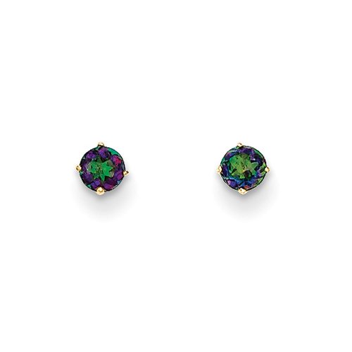 Simple elegance perfect for all ages, a 3mm round genuine mystic topaz prong set in 14k yellow gold with a post back. Color range varies on all natural stones so please allow for slight variations in shades.Feature