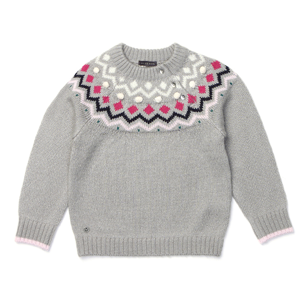 울혼방 원사를 사용한 니트 스웨터로 넥라인을 따라 쟈가드 무늬와 니트 폼폼으로 포인트를 준 스웨터입니다. 절개라인을 따라 단추로 여밈이 가능합니다.