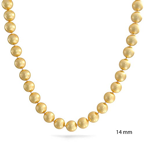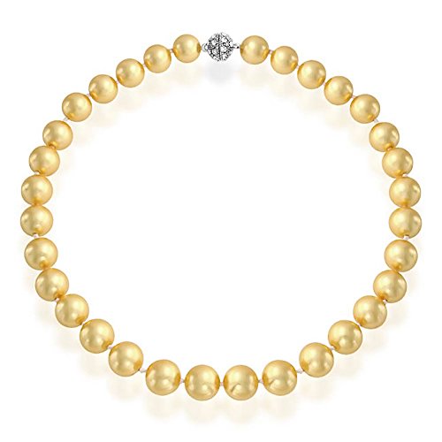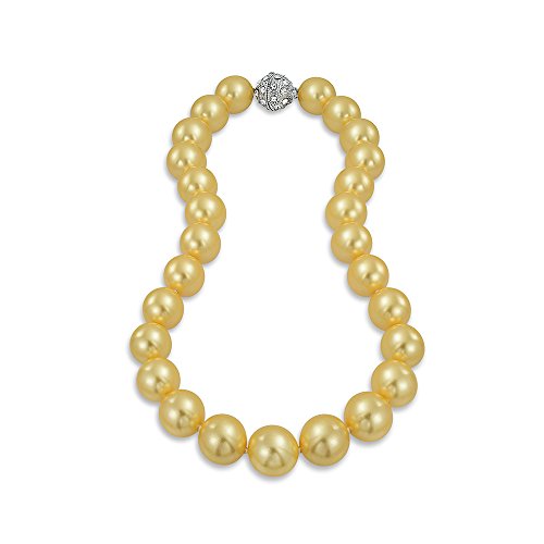 Dress up your wardrobe with this enchanting strand of golden simulated pearls. These golden simulated pearl necklaces are fashionable and versatile. Our affordable wedding necklace is easy to mix and match with other fashion jewelry to add a layered look. The bridal necklace secures with a rhodium plated pave crystal ball clasp for style and security. Give our golden simulated pearl strand necklace to your wedding party as bridesmaid gifts or as unique Mother Day gifts.