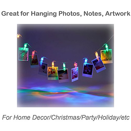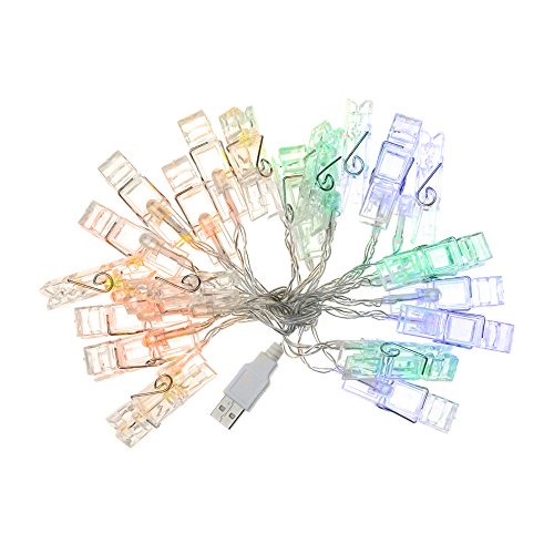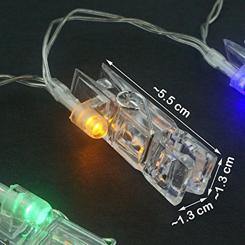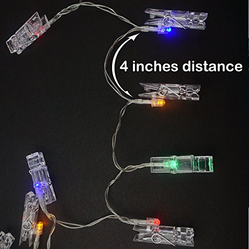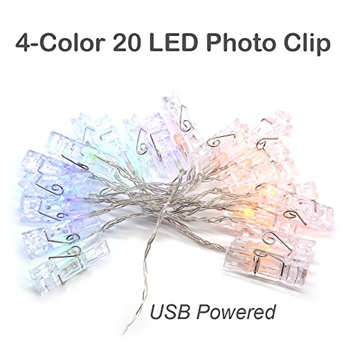 - 2.2-meter light string with 20 clear photo clips- Each photo-clip contains a LED that emits green, red, blue, or orange light, a fun addition to any space. It looks beautiful when turned on at night