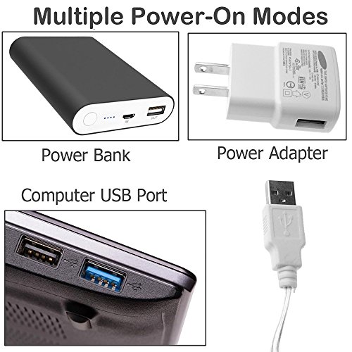 - USB powered. Multiple power-on modes: mobile power supply, power plug, computer USB interface, power bank. Coupled with a power adapter (like your phone charger, not included), it can be plugged into a wall socket, saving you the hassle of having to change batteries constantly.