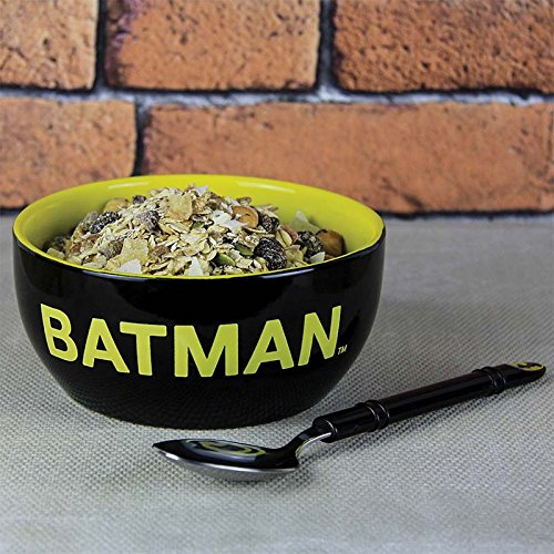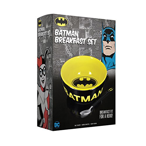 HIGH QUALITY: The DC Comics Batman Breakfast Set includes one bowl made with High Quality ceramic and one metal spoon with durable hard plastic handle. Spoon not suitable for microwave use.