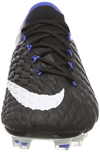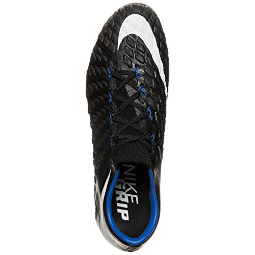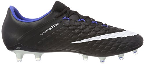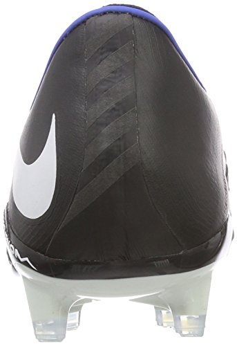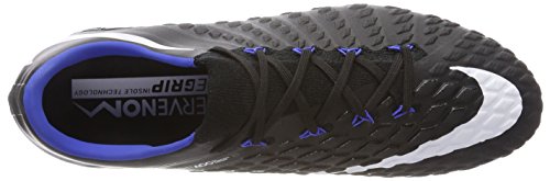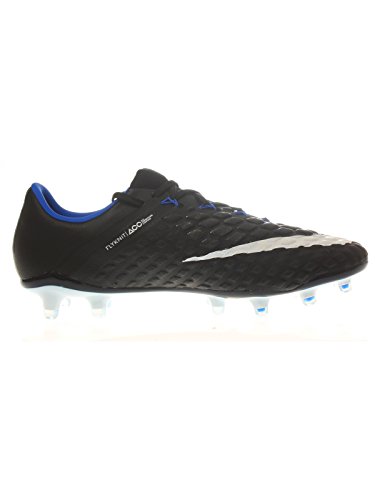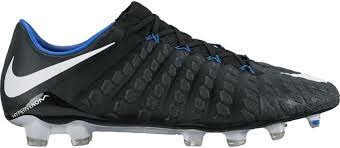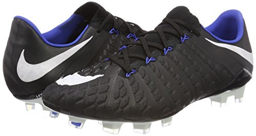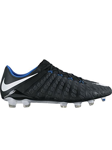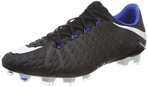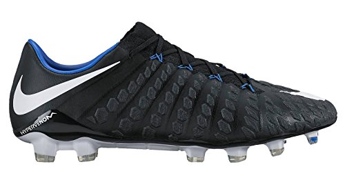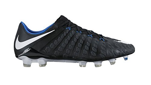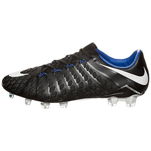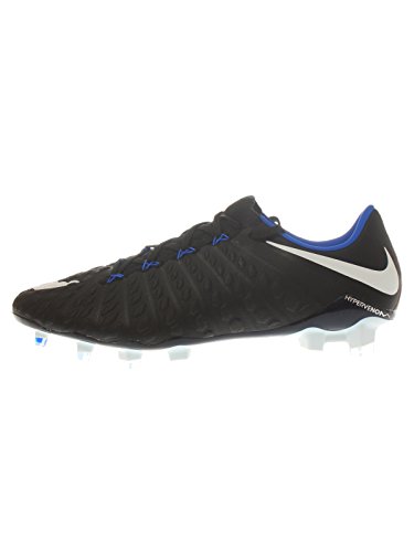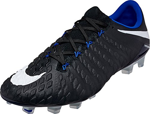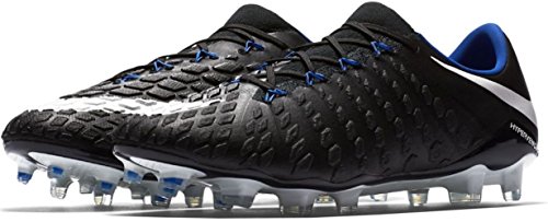 Binding : Apparel Product Description The Nike Hypervenom Phantom III FG Soccer Cleats are another perfect example of why Nike sits at the top of the soccer empire for soccer shoes. These boots provide stability and control and in fact, this same shoe is worn by Man U's leading goal scorer, Wayne Rooney. The Black, White, Dark Grey, and Game Royal sleek colorway make these shoes look just as great as they will feel when you first try the cleats on. These shoes are loaded with comfort. They fit like a second-skin with the Flyknit construction that offers breathability, stretch, and support. The Flywire lockdown uses light but strong cables that are wrapped through the midfoot and integrated through the laces to keep your foot from shifting when side to side movements are made. The texture of the cleats improves your shot on goal. In wet or dry conditions, these shoes provide no distractions and will keep you in control and comfortable for the best playing capabilities. FULL FLYKNIT CONSTRUCTION Innovative Flyknit wraps your foot fully, combining areas of high breathability, stretch and support for the ultimate second-skin fit FLYWIRE LOCKDOWN Ultralight, super-strong cables wrap the midfoot and integrate with the laces to provide stability during side-to-side movements HYPERREACTIVE PLATE The Nike HyperReactive plate features a flexible forefoot for responsive stability, allowing you to cut and change direction fast on firm ground HYPERREACTIVE TEXTURE Texture in the strike zone helps optimize shot velocity CHEVRON STUDS The stud pattern on the lateral side provides traction for acceleration, braking and lateral cuts ACC TECHNOLOGY All Conditions Control (ACC) technology gives you precision control in wet and dry conditions MORE DETAILS Tongueless design helps reduce distractions Asymmetrical lacing system expands the ball control area and strike zone Contoured sockliner wraps and cushions your foot Interior heel counter cups your foot for a locked-down fit. 0