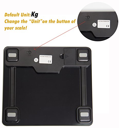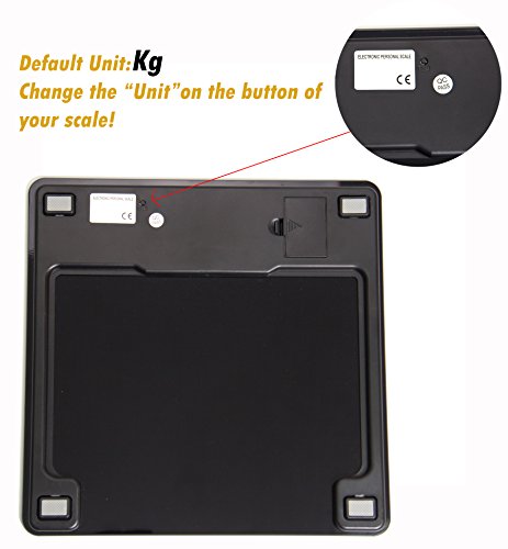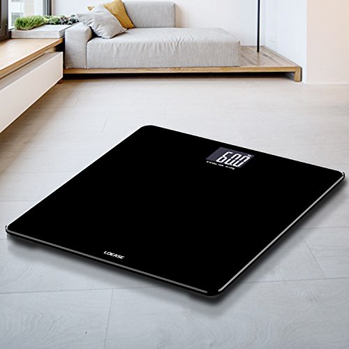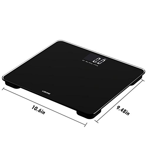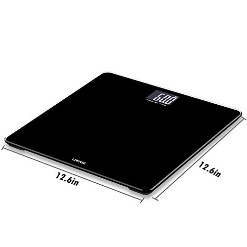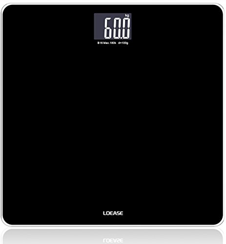 -. Feature : "Step-and-Read" - Immediate readings as soon as you step on the bathroom scale; Measurement Range:11lb-400lb (5kg-180kg) / High accuracy - 4 latest-version high-precision sensors, using technology from Germany / Multifunction - Auto-power-off, Auto-zero, Low battery and overload indication, easy to read backlit LCD display / Safety and comfort - 6mm thick tempered glass provides exceptional sturdiness; Large 12" x 12" platform for your usability / Wide application range - Max weight capacity of 400lb /180kg; graduation increments of 0.2lb /0.1kg; 2 available units of measure: lb, kg; CE/ROHS Approved; 1-Year Warranty by Loease