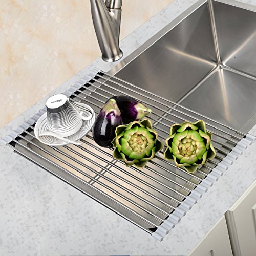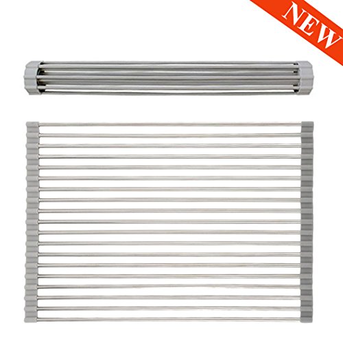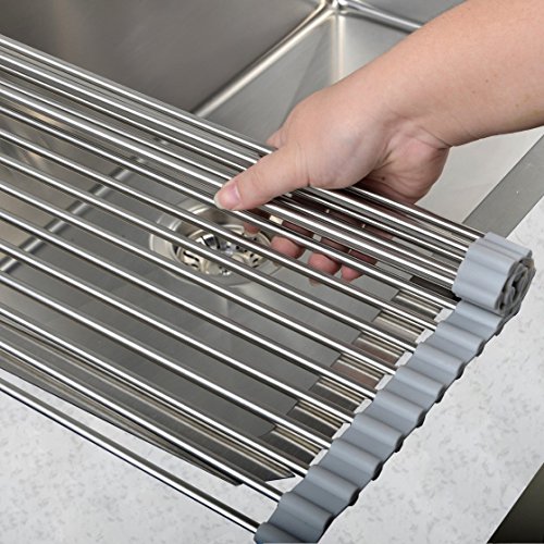VAPSINT Modern Brushed Nickel Stainless Steel Kitchen Sink Roll Up Dish Drying Rack, Easily Store Warm Grey Color Fit for kitchen Sink