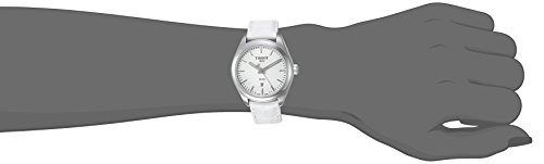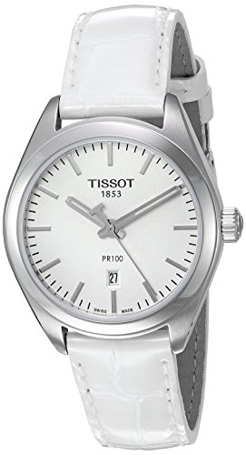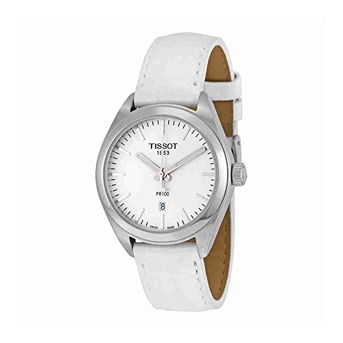 Stainless steel case with a white leather strap. Fixed stainless steel bezel. Silver dial with luminous silver-tone hands and index hour markers. Minute markers around the outer rim. Dial Type: Analog. Luminescent hands. Date display at the 6 o'clock position. Quartz movement. Scratch resistant sapphire crystal. Solid case back. Case diameter: 33 mm. Case thickness: 9 mm. Round case shape. Tang clasp. Water resistant at 100 meters / 330 feet. Functions: date, hour, minute, second. Casual watch style. Tissot PR100 White Dial White Leather Ladies Watch T1012101603100.Feature