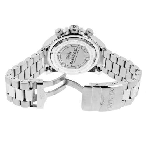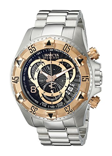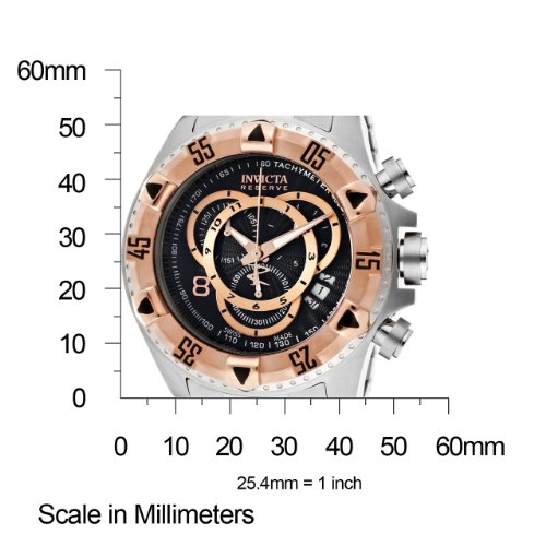 -. Feature : Invicta Reserve 5-Year Warranty Included with Shipment / Flame-fusion crystal; stainless steel case and bracelet / Chronograph functions with 60 second, 30 minute and 1/10th of a second rose gold tone bordered subdials; date function / Black textured dial with rose gold tone hands and Arabic numeral 8; luminous; unidirectional 18k rose gold ion-plated stainless steel bezel; tachymeter scale on outer edge of dial; screw-down crown / Water resistant to 660 feet (200 M): suitable for recreational scuba diving