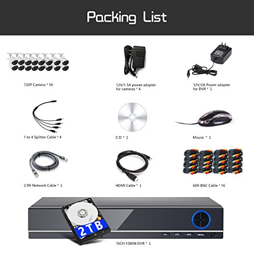-. Title : IHOMEGUARD 16 Channel 1080N DVR Video Recorder Security Camera System with 16PCS Outdoor 720P HD 1500TVL Surveillance Camera System with 2TB Hard Drive