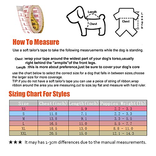 -. Feature : High Quality for comfortable, achive fit. / Not all dogs' measurement match the table reference at the three points (Chest*Length*Puppy Weight) at the same time,please give the priority to Breast Girth.If the size your measured is in-between two sizes, please select the larger size.All the detailed size is shown in our picture.Size: S(Chest:11.8",Length:7.1",Weight:2.2-3.3lb), M(Chest:13.8",Length:9.1",Weight:3.3-5.5lb), L(Chest:16.5",Length:11",Weight:5.5-7.7lb), XL(Chest:18.5",Length:13",Weight:8.8-11lb) / Makes your dog warmer and more stylish & cool / Humanized design with the button of the cloth,makes your pet more lovely,fashion / Perfect for walking,jogging Keeps pet safe and easy to spot