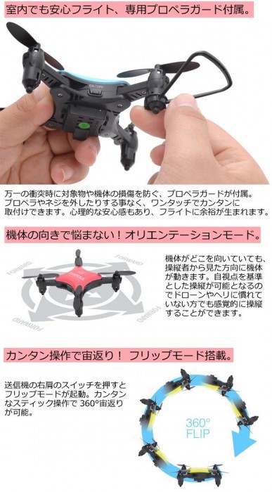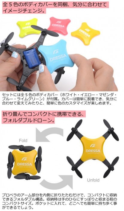 | 全5色のボディカバーが同梱されているので、気分に合わせてイメージチェンジできるドレスアップドローンです。プロペラのアーム部分を内側に折りたたむだけで、コンパクトに収納できるフォルダブル構造になっています。 |