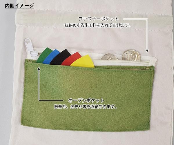 | 紐で閉じることができるので、中身が落ちにくく取り出しやすい形状。内側にファスナーポケットとオープンポケット付きで、朱印料や拝領した散華やお守り等を入れておけます。落ち着きのある梨地仕上げの生地を使用しており、老若男女どなたにもお使いいただけます。 |