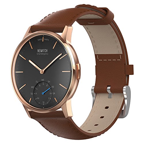 -. Feature : Quartz Analog Smartwatch - Stylish design with 40mm superb stainless steel case, sapphire dial window, luminous hands and hour markers, Switzerland gear box, and Italian leather band. / Activity Tracking - Built-in fitness tracker tracks your everyday accomplishments including steps, distance, and calories burned; remind you the phone calls and messages with vibration and flash. / Health Notification - Heart rate monitoring and sedentary reminder; track your sleep duration and quality; automatic time and date adjustment between different time zones. / 164FT/50M Waterproof - Support hands/face washing, sweating, raining, even swimming and bath in cold water with a replacement metal or silicon strap. But don't press any buttons underwater and keep it away from STEAM and HOT WATER. / No Charging Needed - Up to 8 months long battery life(based on actual use) with a CR2430 button cell; Compatible with phones running Android 4.3+ or iOS 7.0+. Download Newatch APP from Apple Store or Google Play.