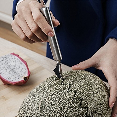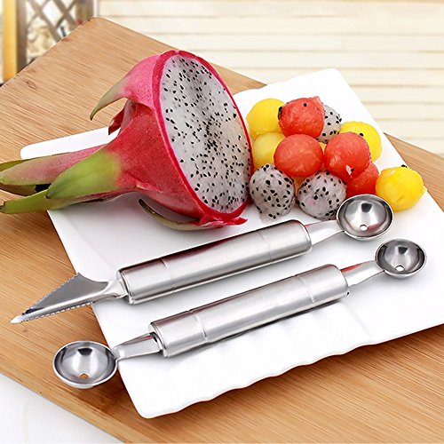 Bonus dual-purpose melon baller. The baller end helps you scoop the spherical balls of the fruits or ice cream. The carving end motivate your creative on fruit decorations. Perfect fruit salads are never difficult from now on. They are all packaged in a exquisite box with instruction pictures.