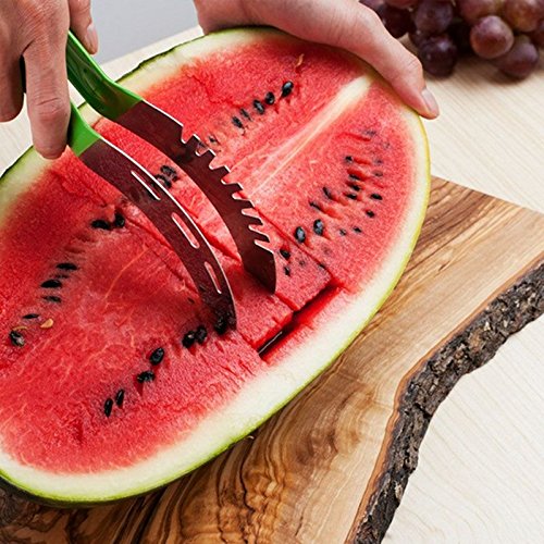 Ingenious design. The small steel wire is movable on both ends. It holds the two blades together and separate, act as a grip catch out and put down the watermelon slices. The two blades are very sharp inside and blunt outside that allow you slice the watermelon smoothly and no worry hurt yourself.