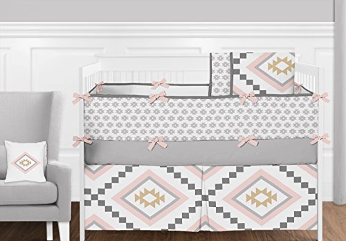 -. Title : Blush Pink, Gold, Grey and White Boho Aztec Girl Baby Crib Bedding Set with Bumper - 9 Pieces
