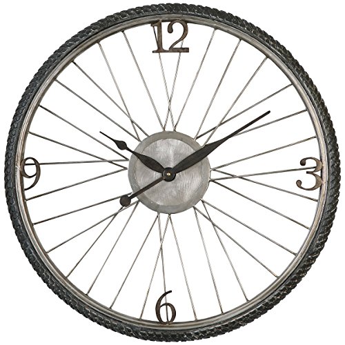 The Uttermost Spokes 26 in. Wall Clock makes a perfect gift for your favorite cycling enthusiast - even if that’s you. The clock face is modeled after a spoked bicycle tire and finished in antiqued silver champagne with aged black details. Large numerals complete the look. Analog with quartz movement. The mission of The Uttermost Company is simple: to make great home accessories at a reasonable price. This has been their objective since founding their family-owned business over 30 years ago. Uttermost manufactures mirrors, art, metal wall art, lamps, accessories, clocks, and lighting fixtures in its Rocky Mount, Virginia factories. They provide quality furnishings throughout North and South America, Europe, and Asia from their state-of-the-art distribution center located on the West Coast of the United States. Dimensions: 26.25 diam. x 1.5D inches. Metal and resin frame. Antiqued silver champagne with aged black details. Spoked bicycle tire face with large numerals. Analog with quartz movement.