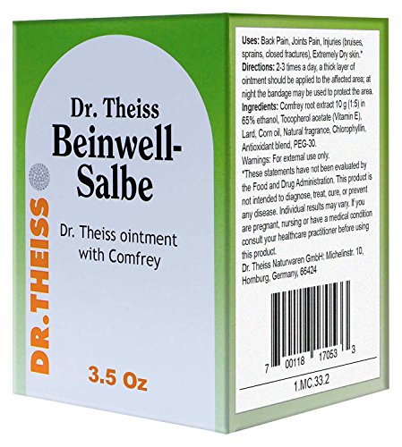 -. Binding : Health and Beauty -. Brand : Dr Dry -. EAN : 0700118170533 -. Feature : Powerful 100% Natural Joint Support* / Helps to reduce back pain and joint pain* / Manufactured for 20 years. Time-tested / Manufacture dates as well as Expiration dates indicated on the package are in European format which is DD/MM/YY. / Made In Germany -. IsAdultProduct : 0 -. Label : Dr. Theiss Naturwaren GmbH -. Manufacturer : Dr. Theiss Naturwaren GmbH -. MPN : 3 -. PackageQuantity : 1 -. PartNumber : 3 -. ProductGroup : Health and Beauty -. ProductTypeName : HEALTH_PERSONAL_CARE -. Publisher : Dr. Theiss Naturwaren GmbH -. Studio : Dr. Theiss Naturwaren GmbH -. Title : Dr. Theiss Beinwell Salbe (ointment with Comfrey and vitamine E) 100g/3.5oz -. UPC : 700118170533