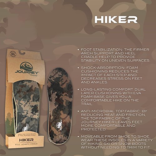 Studio : Powerstep Insoles Publisher : Powerstep Insoles Binding : Apparel Product Description For stability and cushioning during rigorous activity on rugged terrain, the Journey Hiker provides the comfort you need. With a firmer arch support, the Journey Hiker stabilizes your foot while also allowing for flexibility. This insole fits in most outdoor athletic shoes such as hiking, snow and ski boots and trail running shoes with no trimming necessary. Reduce fatigue and protect your feet on long trips with the Journey Hiker. Powerstep has been providing the highest-quality in orthotic shoe insoles since 1992, when our founder, a podiatrist, foot surgeon and runner, saw the need for a ready-to-wear orthotic that would be more convenient and more affordable than custom-made orthotics. Our products are found in retail stores throughout the country and are the leading brand of orthotic shoe insoles prescribed by a range of medical professionals. At Powerstep, we’re committed to continuing to produce the best in orthotic shoe insoles to help reduce foot pain. 0